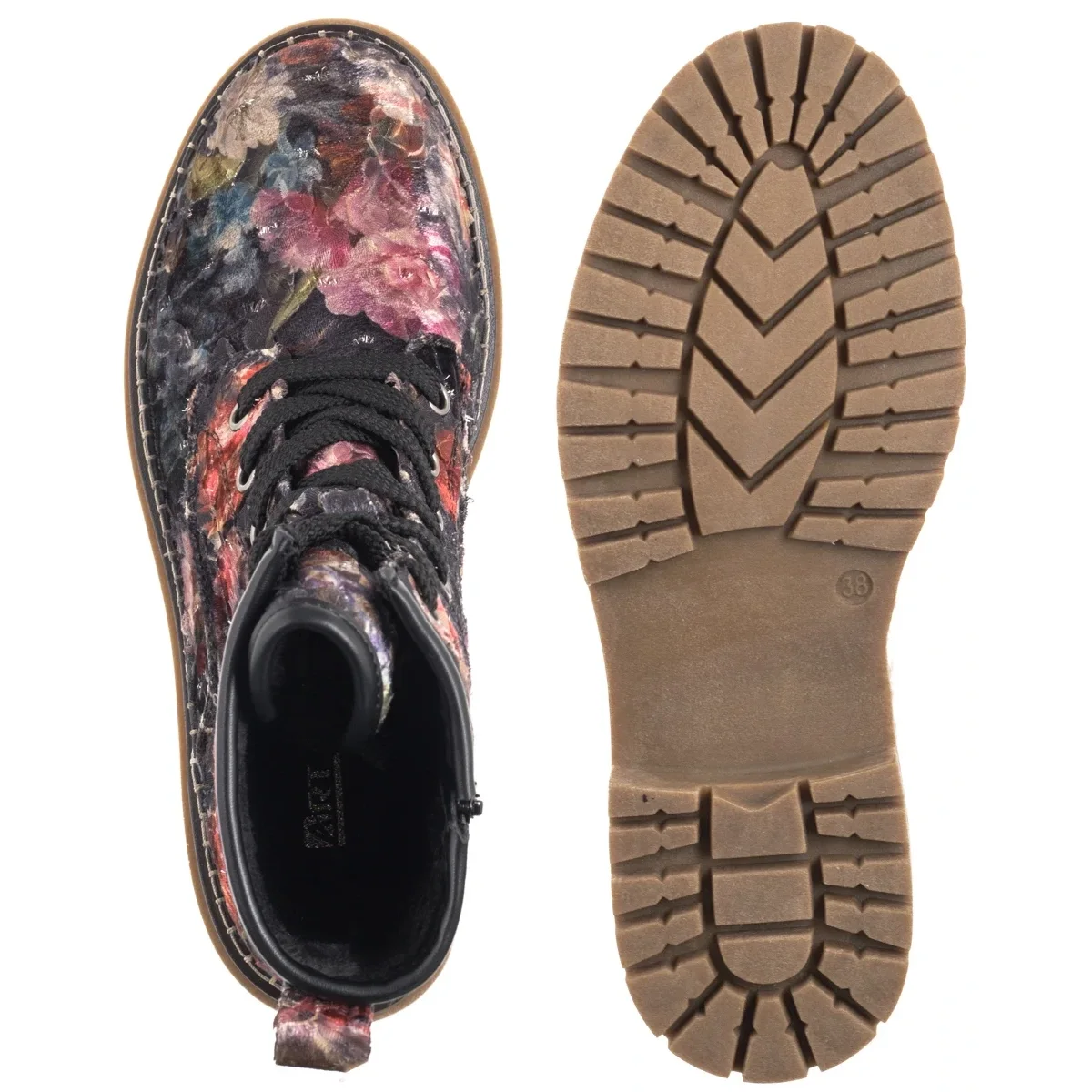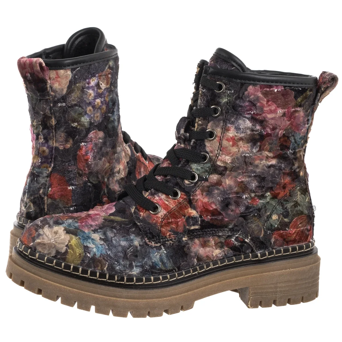 Podwyższona cholewka została wykonana z materiału tekstylnego w efektownym, kwiatowym wzorze multikolor.