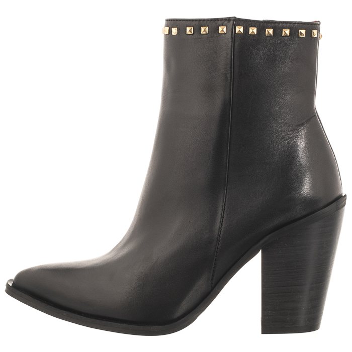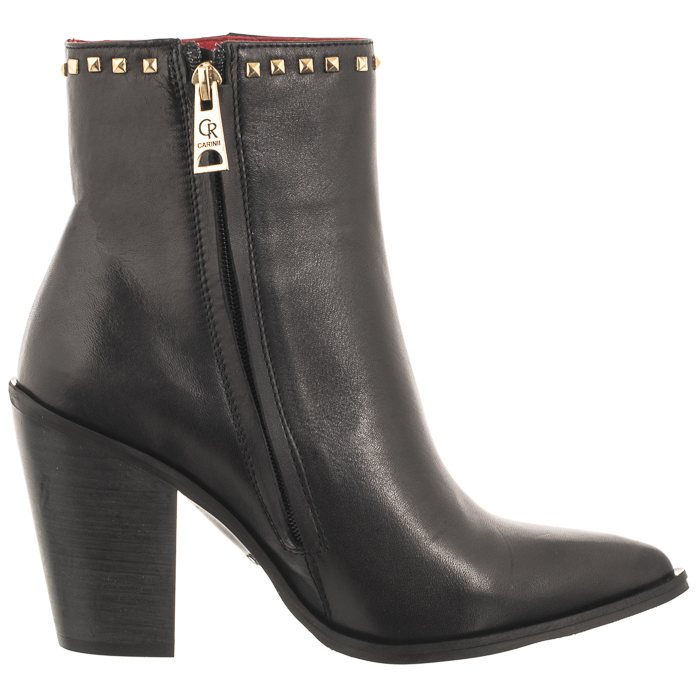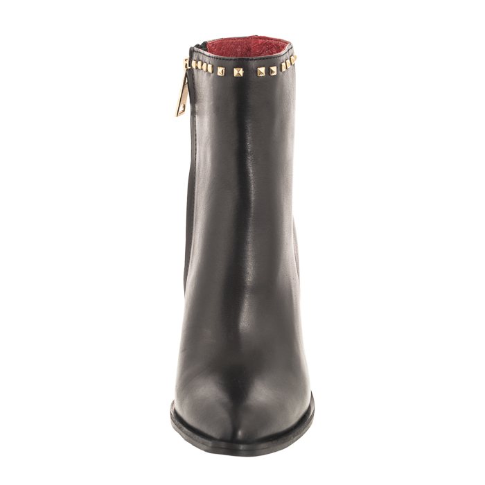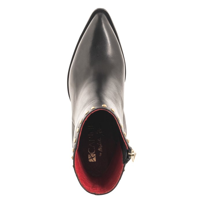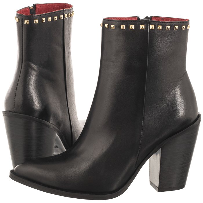 Uszyta z naturalnej licowej skóry cholewka ozdobiona została złotymi ćwiekami.