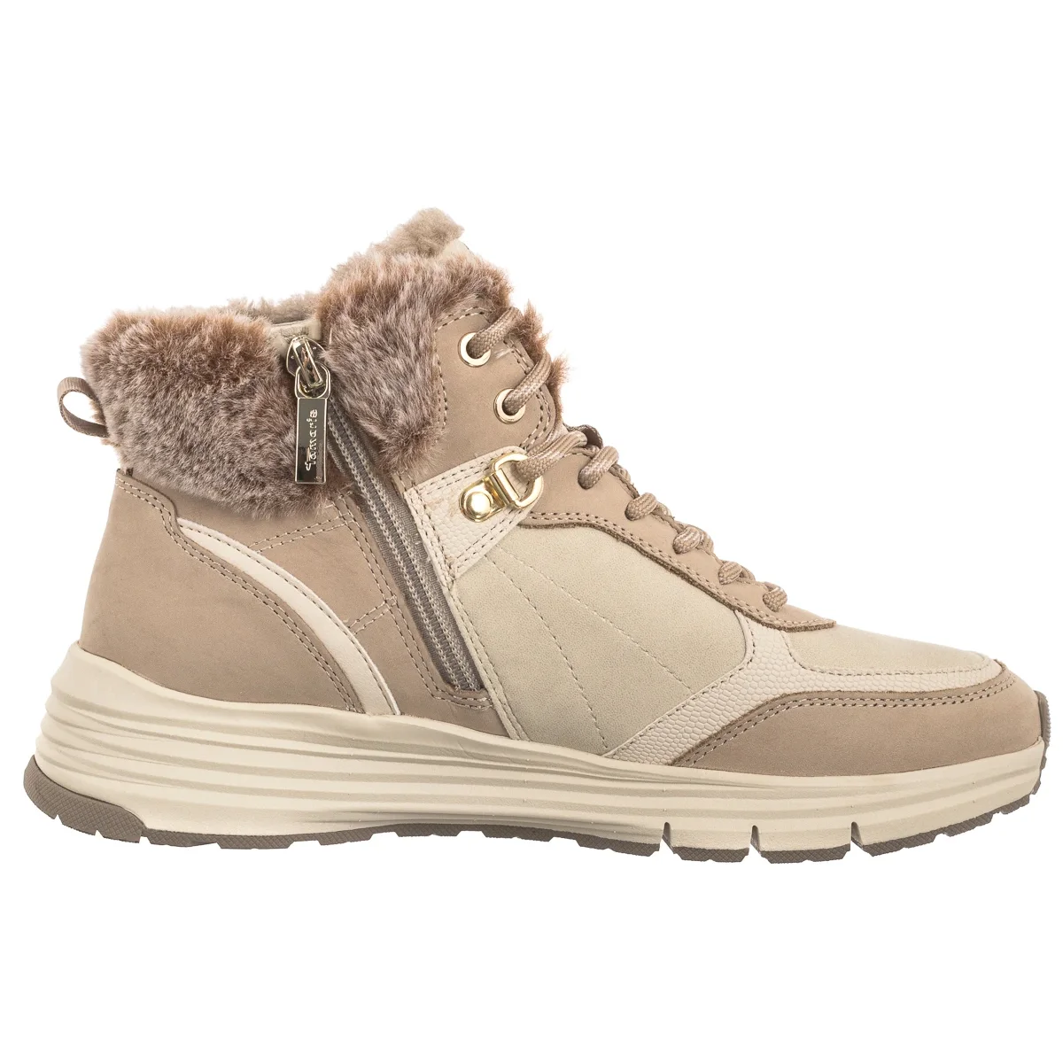 Sznurowana cholewka pozwala na idealne dopasowanie się obuwia do stopy, a boczny suwak ułatwia zakładanie.