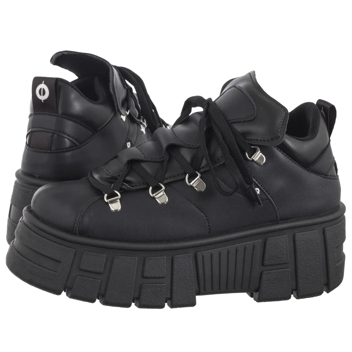Metalowe haczyki i grube sznurowadła nadają butom industrialnego, rockowego stylu.