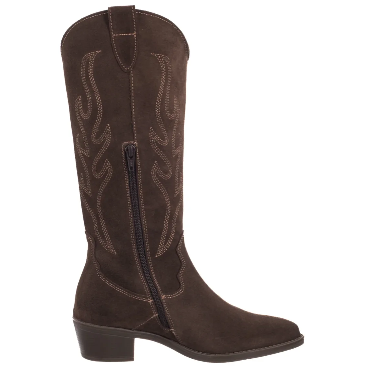 • Cholewka sięgająca do połowy łydki wykonana została z miękkiego weluru, który nadaje obuwiu szlachetny wygląd oraz przyjemną w dotyku strukturę.