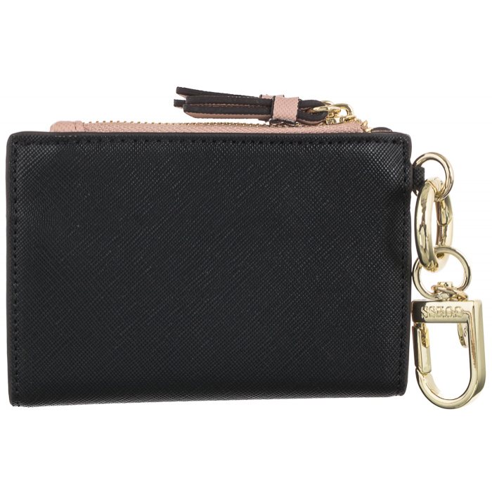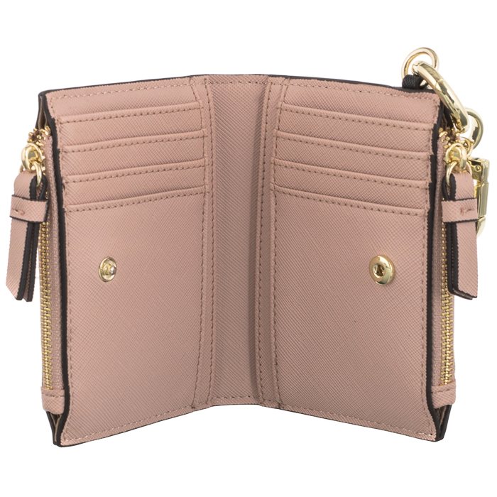 Możesz przyczepić portmonetkę do torebki za pomocą metalowej zawieszki z karabińczykiem w kolorze złota.