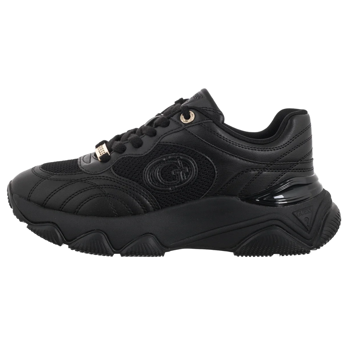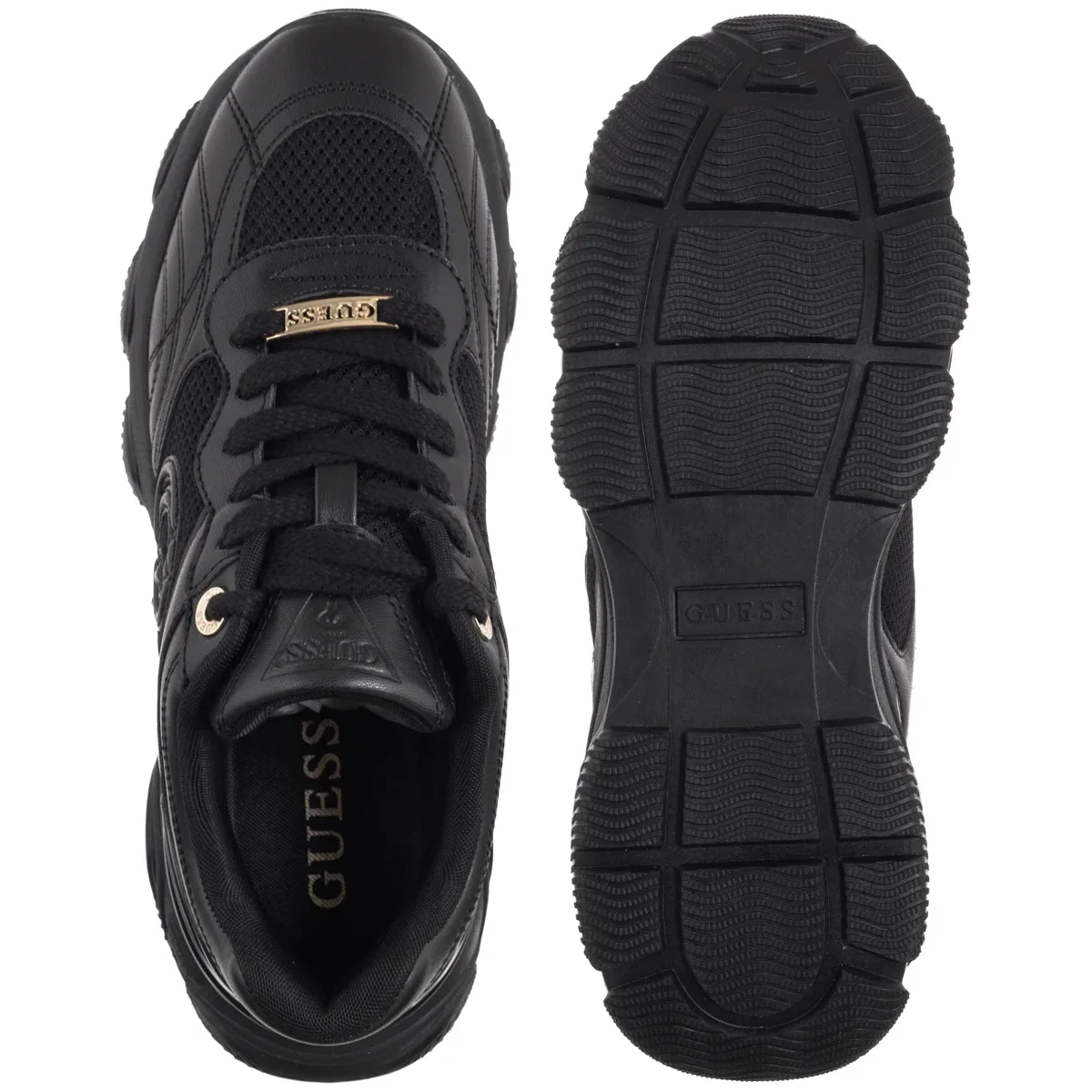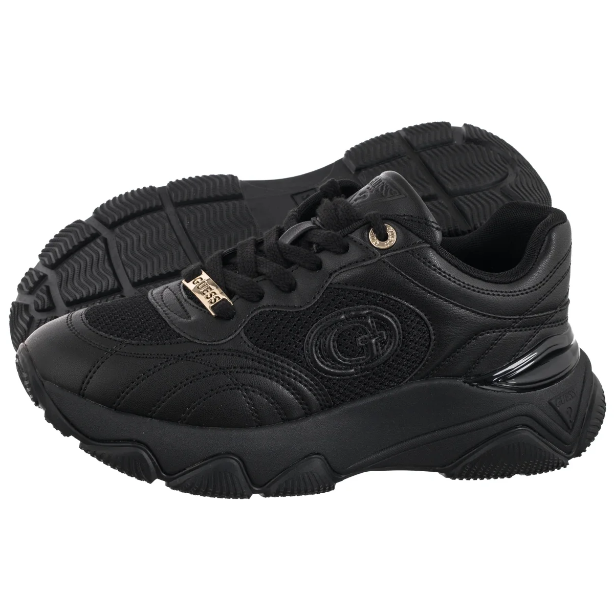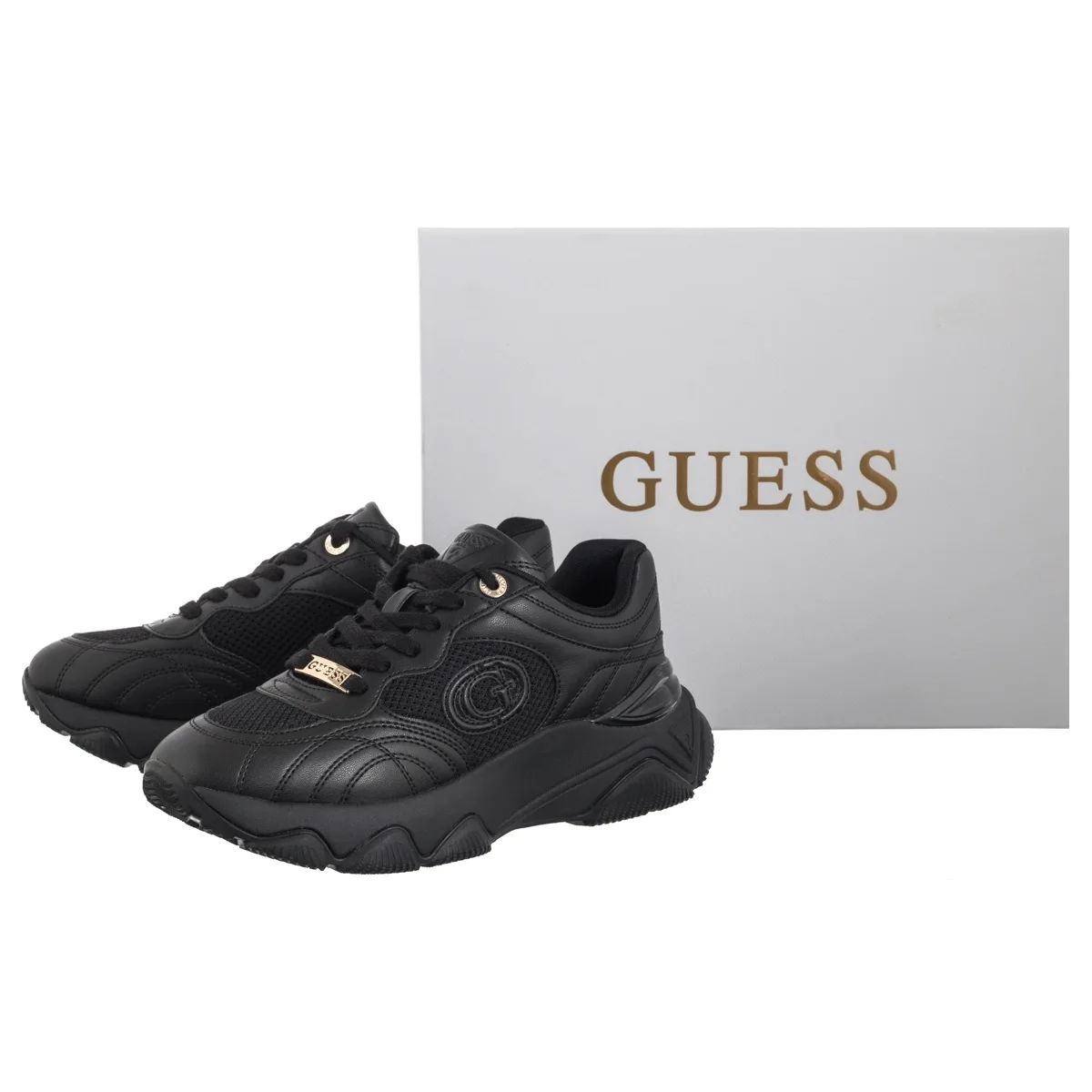 • Buty ozdobione są charakterystycznym logo Guess – z przodu, na podeszwie oraz z boku, a także trójkątnym detalem, podkreślającym markowy styl.