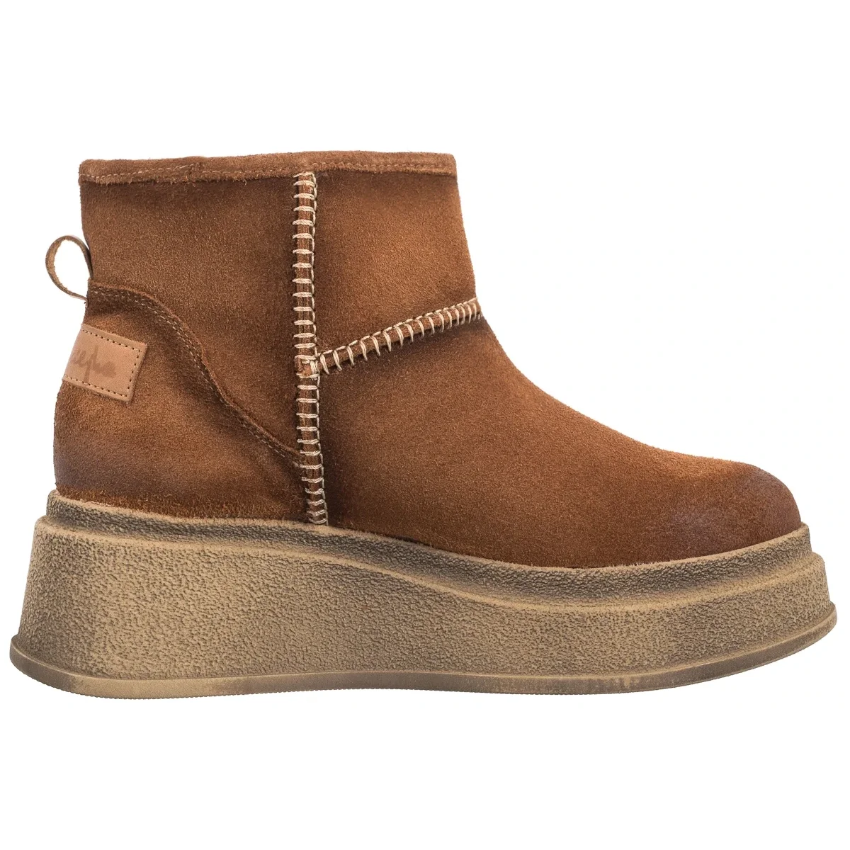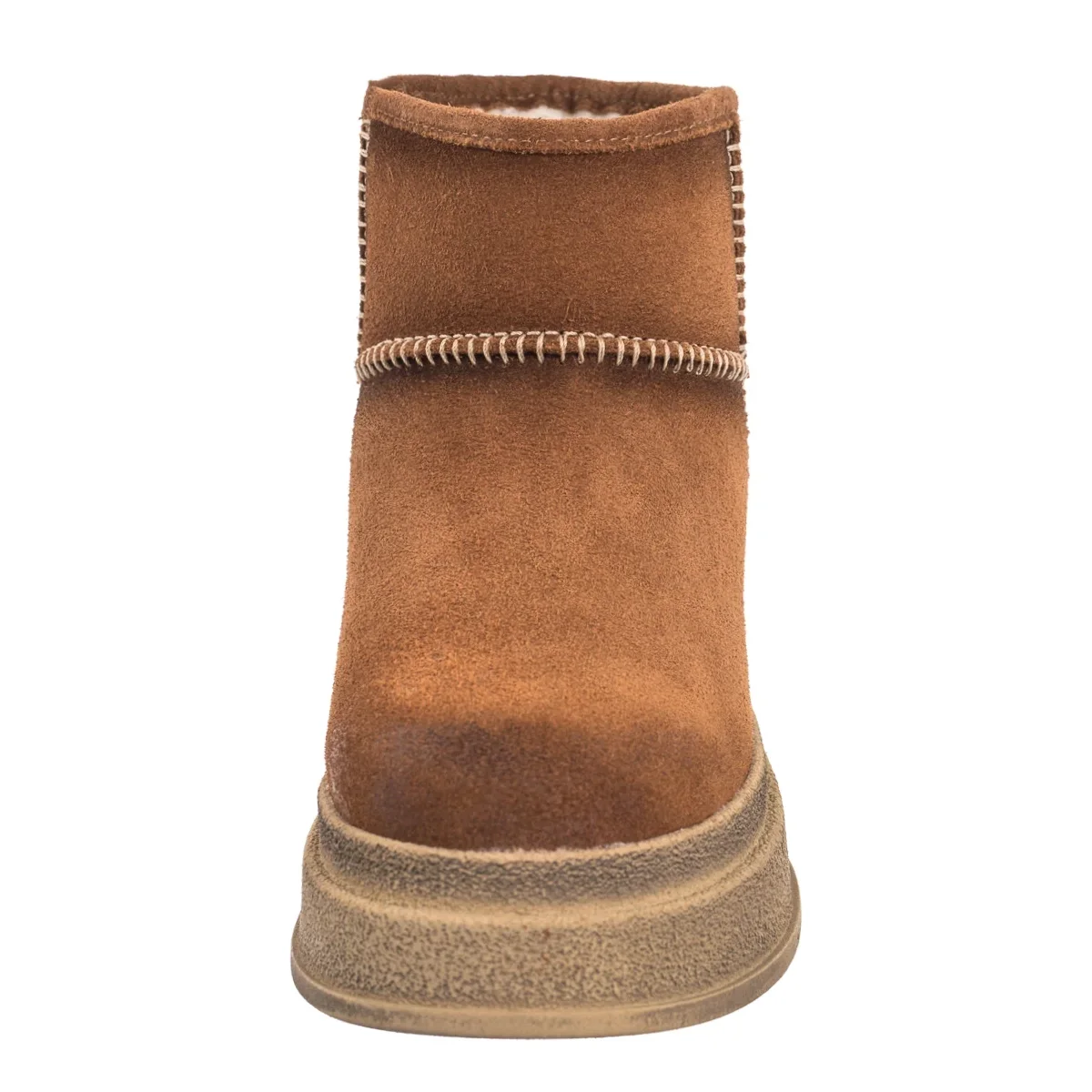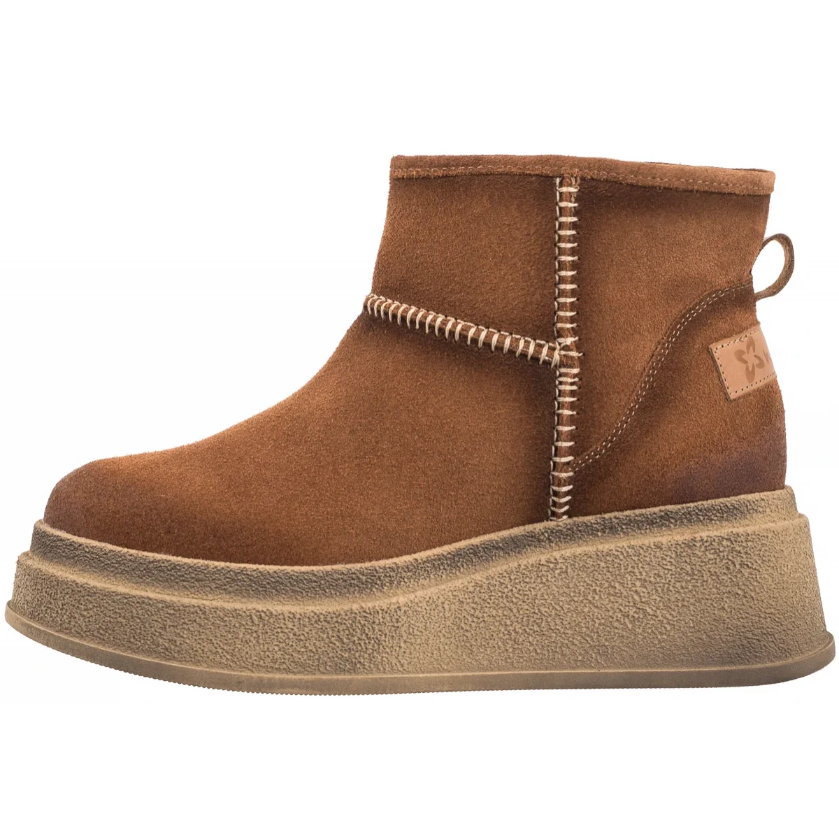 • Cholewka buta za kostkę została wykonana z naturalnej skóry welurowej i ozdobiona jasnymi przeszyciami.